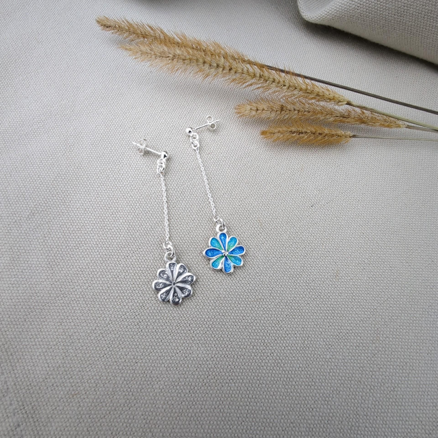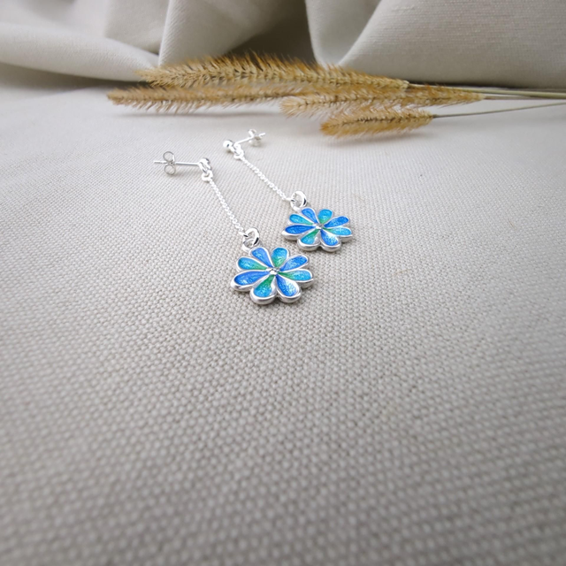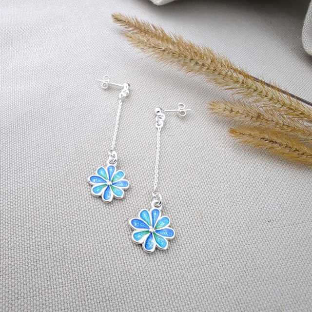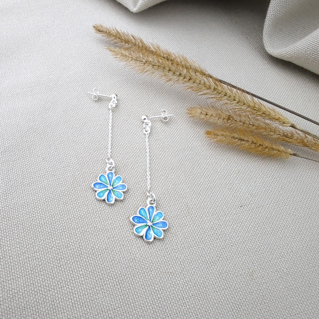 Ces boucles d’oreilles pendantes allient l’élégance intemporelle et la délicatesse de l’émail pour un rendu floral raffiné. Chaque fleur de marguerite, finement ciselée, est rehaussée d’émaux transparents colorés qui captent la lumière et apportent une touche de poésie à votre tenue.