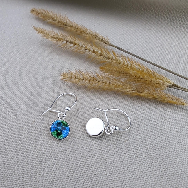De la fine feuille d'argent, aussi appelée paillon d'argent, a été utilisée pour accentuer les jeux de lumière avec les couleurs en émail. Ces boucles d'oreilles sont donc très lumineuses et varieront aux gré de la luminosité.