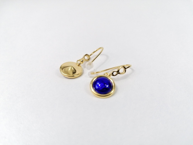 L'ensemble des montures et des crochets sont en argent 925 plaqué à l'Or 24 carats et de fabrication européenne. Des boutons poussoirs en silicone transparent vous sont fournis.