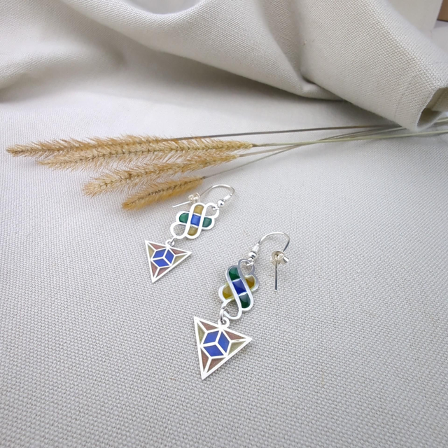 Les émaux bijoutiers, 100% fabriqués en France, sont de couleurs transparentes : bleu nuit, jaune et vert sapin sur la partie frise, et jaune, orange et bleu nuit sur la partie triangle.