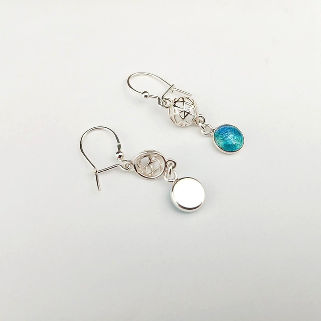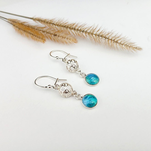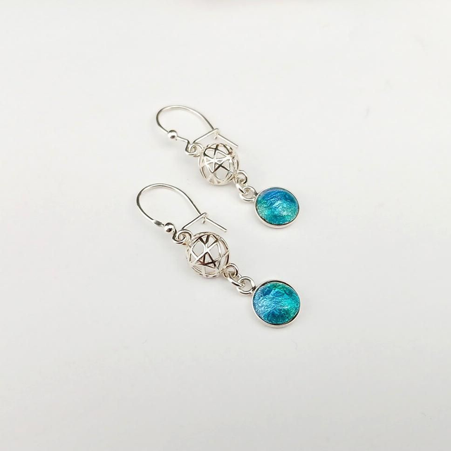 Ces boucles d'oreilles sont composées de demies sphères ajourées et de deux cabochons en émail sur cuivre paillonné de feuilles d'argent.