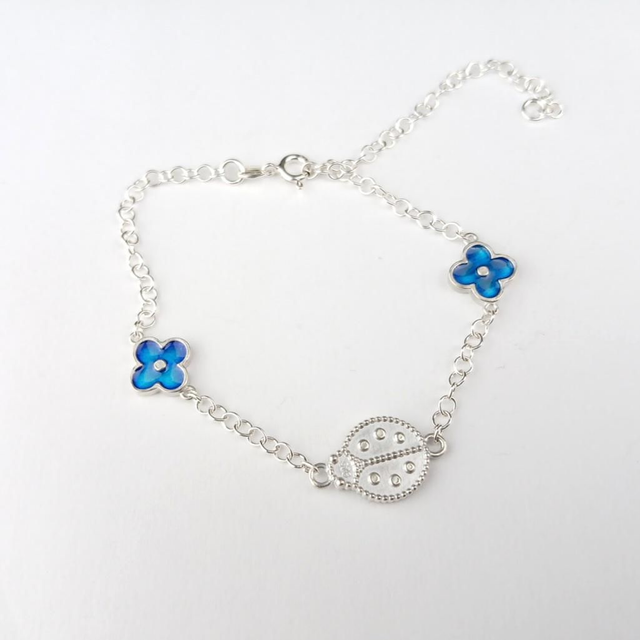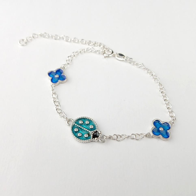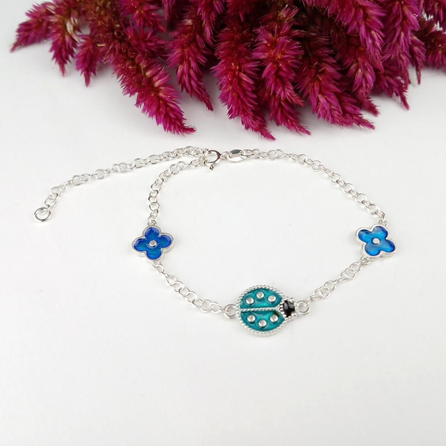 Ce bracelet en argent est agrémenté de 3 éléments en émail champlevé sur argent. Il a pour forme une coccinelle et ses deux petites fleurs pour insuffler l'idée de bonheur, de liberté et de créativité.