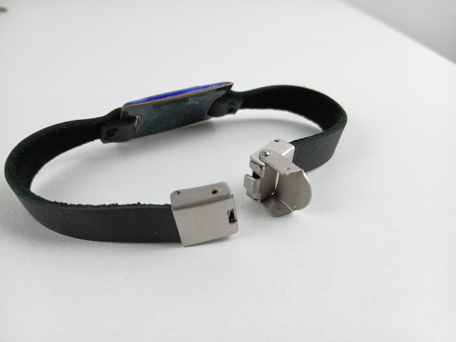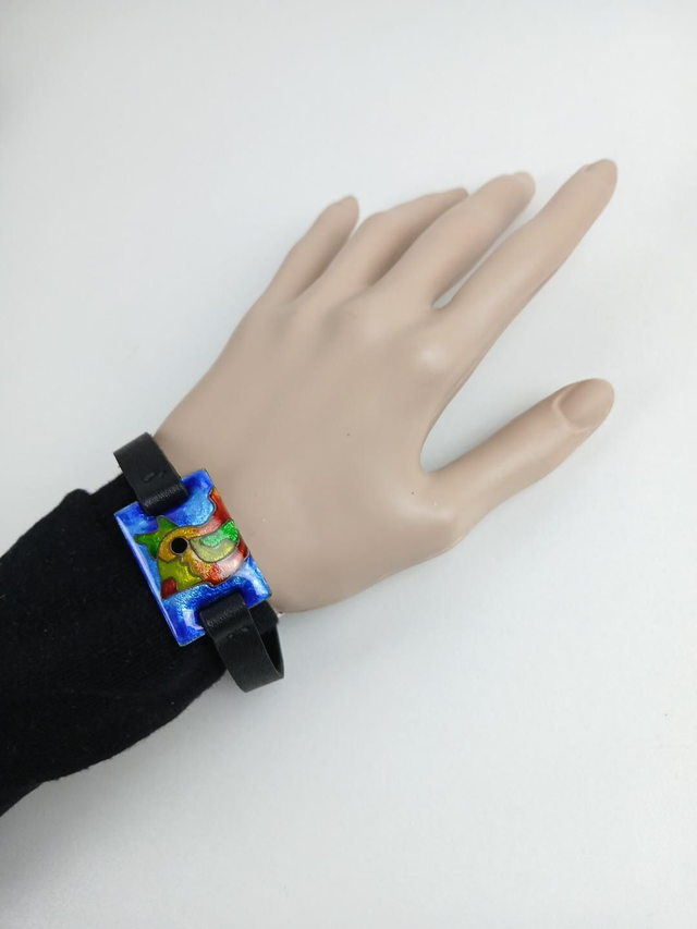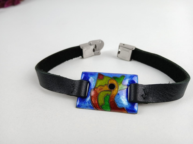 Ce bracelet en cuir est décoré d'un émail cloisonné d'argent sur cuivre et sur paillon d'argent.