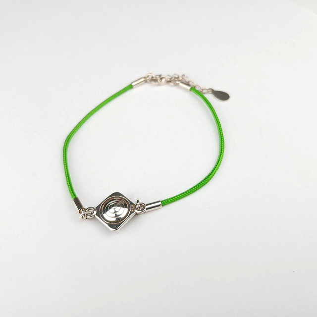 Ce bracelet en argent et cordon coton vert pomme est agrémenté d'un émail sur cuivre.