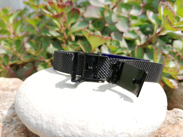Le bracelet montre est en maille d'acier inoxydable noir. Il est aisaiement réglable grâce au système coulissant de type montre.