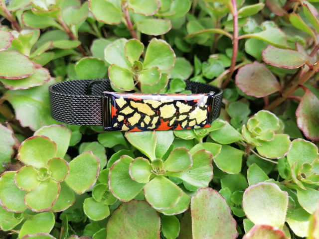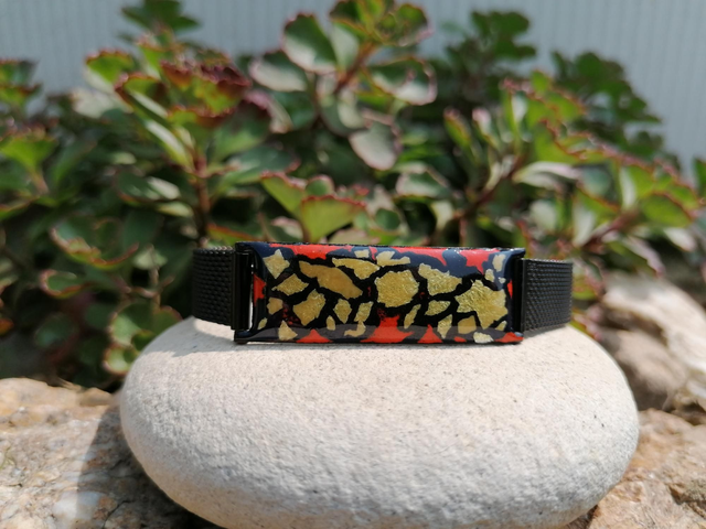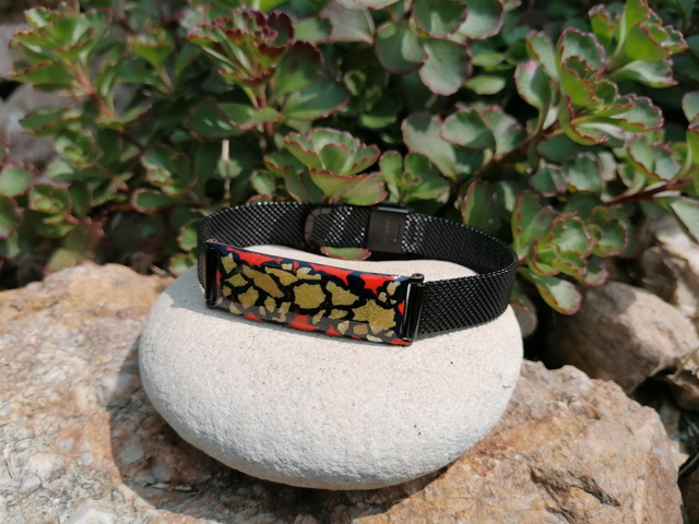 Ce bracelet montre est décoré d'un émail sur cuivre et à la feuille d'argent.