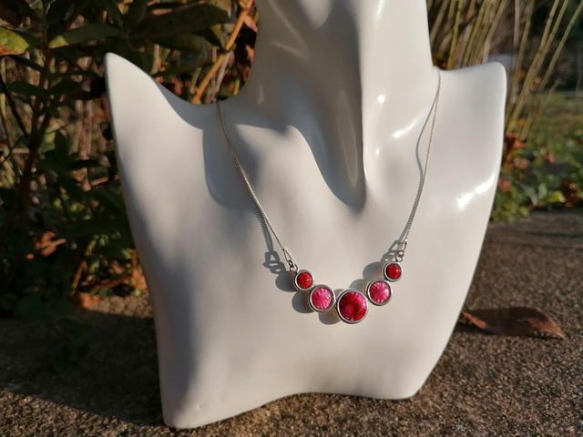 Ce collier est l'emblème de la féminité avec sa couleur rose intense et profonde. Le rose est très tendance et représente la tendresse, le romantisme, la séduction mais aussi le bonheur.