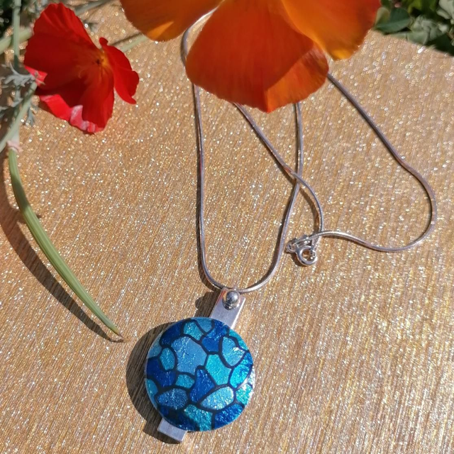Ici, l'émaillage sur feuille d'argent aussi appelé "paillon d'argent" permet de rendre des couleurs brillantes aux reflets changeants. Il implique un soin des émaux transparents, de multiples couches d'émail et plusieurs cuissons autour de 850°. L'Art de l'émail grand feu c'est de la minutie, des savoir-faire spécifiques, de la dextérité et beaucoup de patience donc de temps.