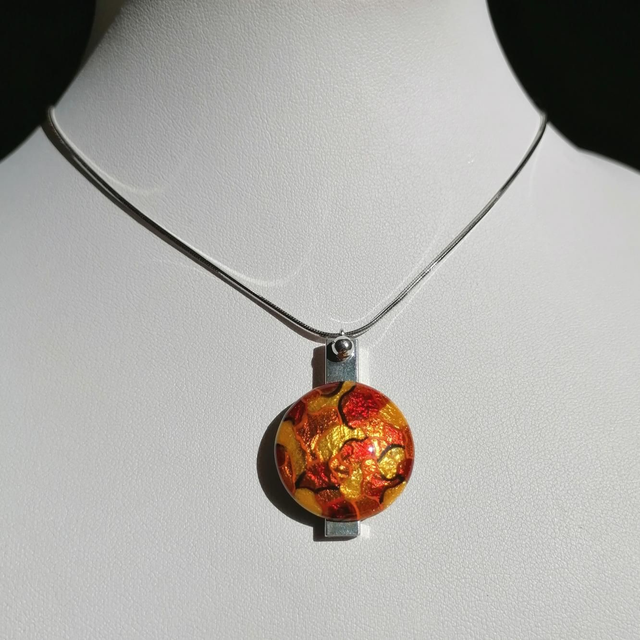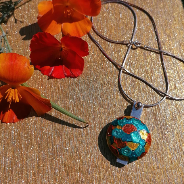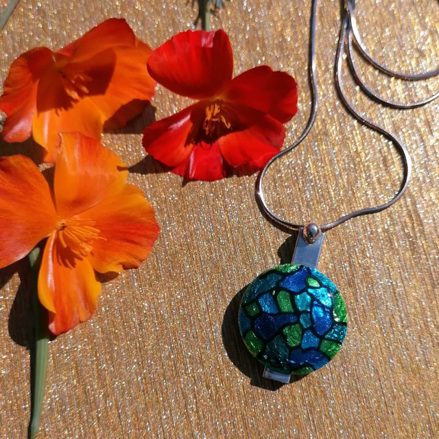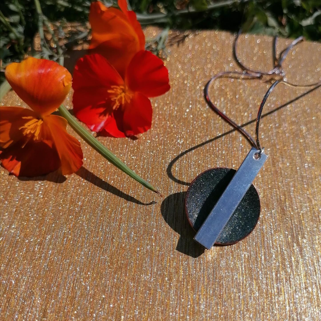 Ces colliers sont en émail sur cuivre et sur feuille d'argent. Ils font partie de la collection '' Talisman '' qui existent en plusieurs coloris.