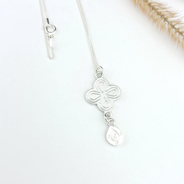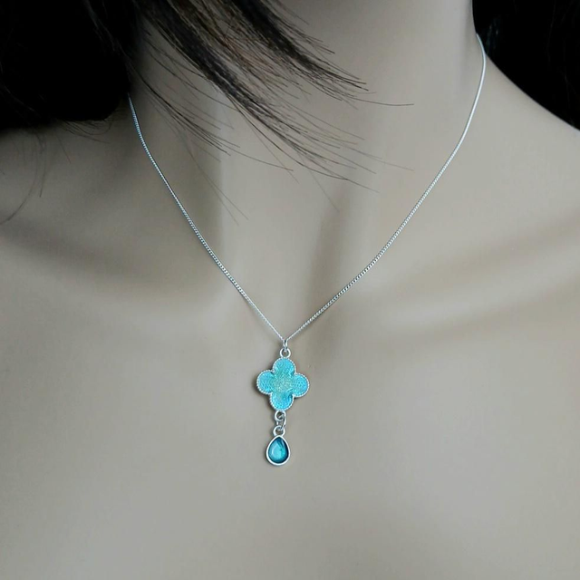 Dimensions du pendentif avec le trèfle et la goutte : 3,5cm x 1,5cm.
