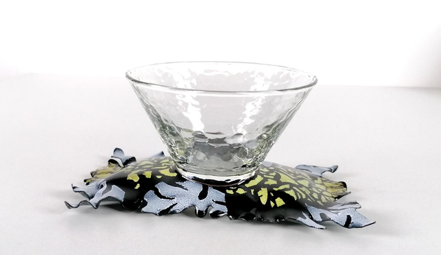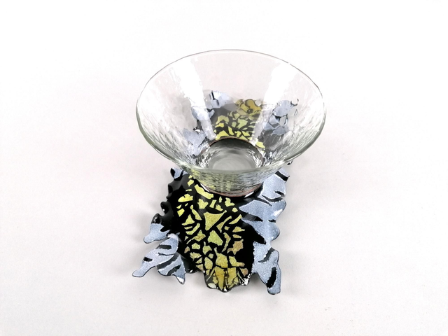 La pièce émaillée est associée à un pot en verre texturé qui mesure 11cmx8cm.