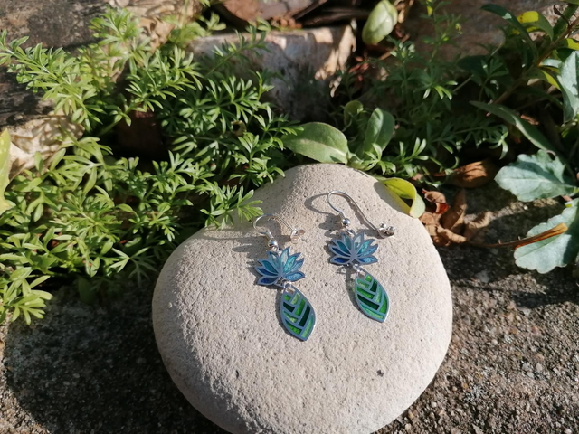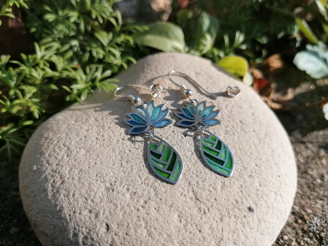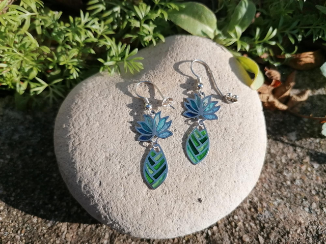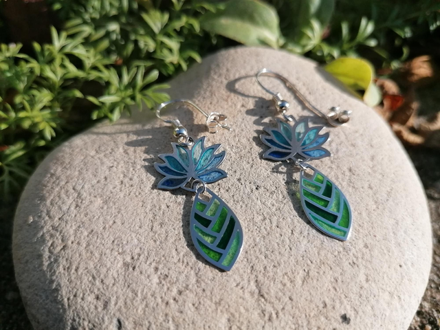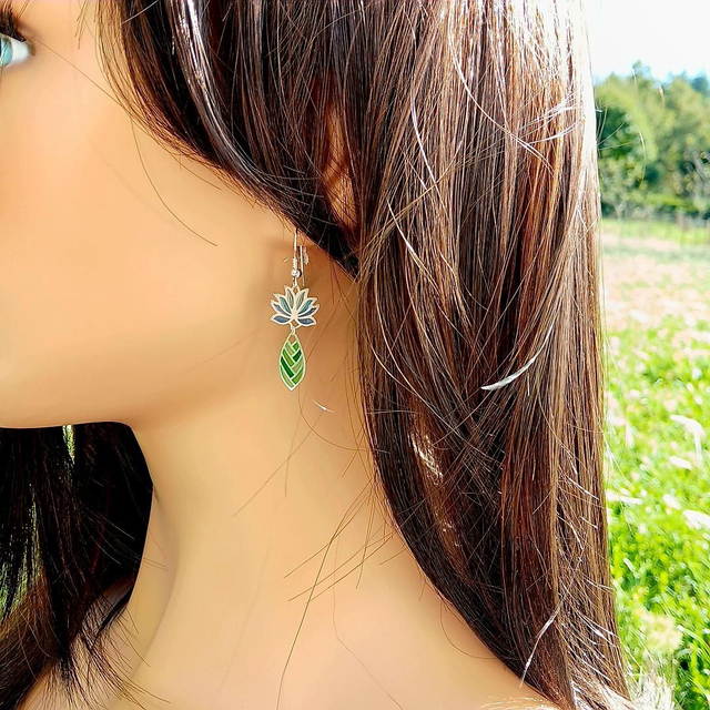 Les fleurs de lotus sont charmantes par leur forme symétrique et leurs couleurs. Elles sont sacrées dans plusieurs parties du monde. Ces boucles d'oreilles feront tourner les têtes avec leurs reflets scintillants produits par la technique délicate de l'émail plique à jour. Les couleurs se laisseront traverser par la lumière changeante à la façon du vitrail. Elles sont très légères à porter.