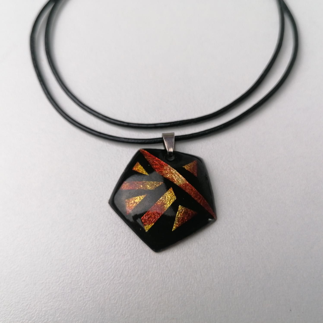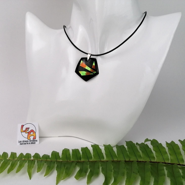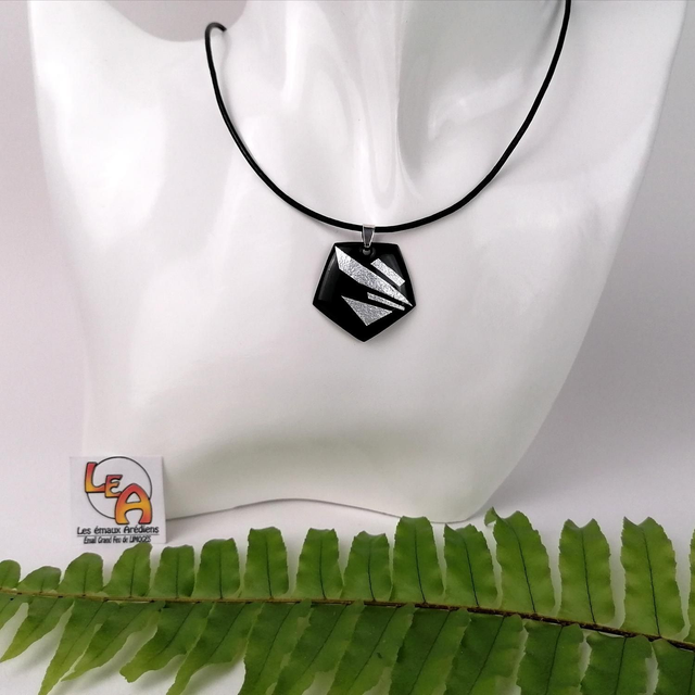 Ce pendentif en forme de polygone est en émail sur cuivre noir et agrémenté de feuille d'argent. Il sera parfait pour apporter une touche chic et lumineuse à votre tenue.