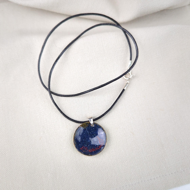 Ce collier est monté sur un cordon de cuir et des montures (bélière et fermoir) en Argent 925 de fabrication européenne.
