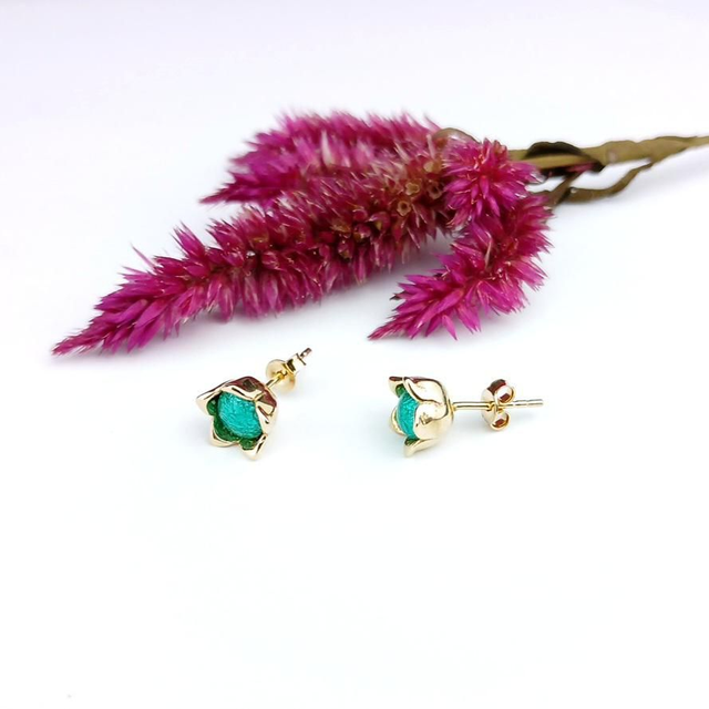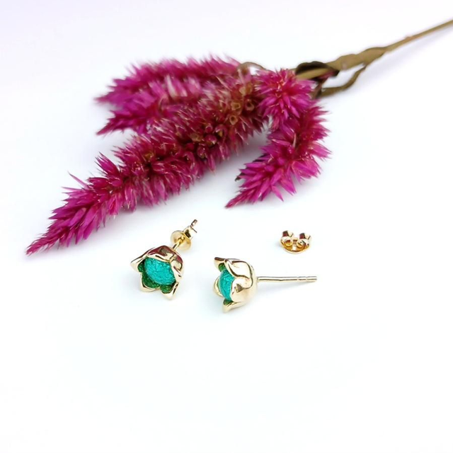 Les montures, crochets et boutons poussoirs sont en argent 925 plaqué à l'Or fin 18 carats de fabrication européenne. Ces puces d'oreilles se portent directement sur le lobe de l'oreille.