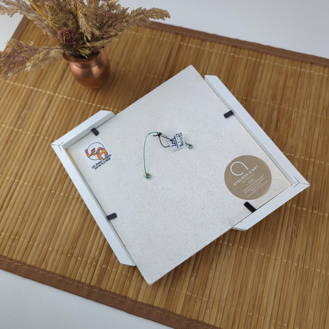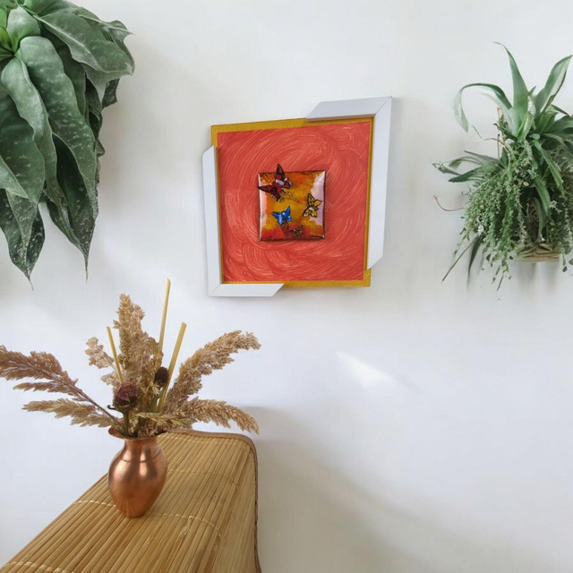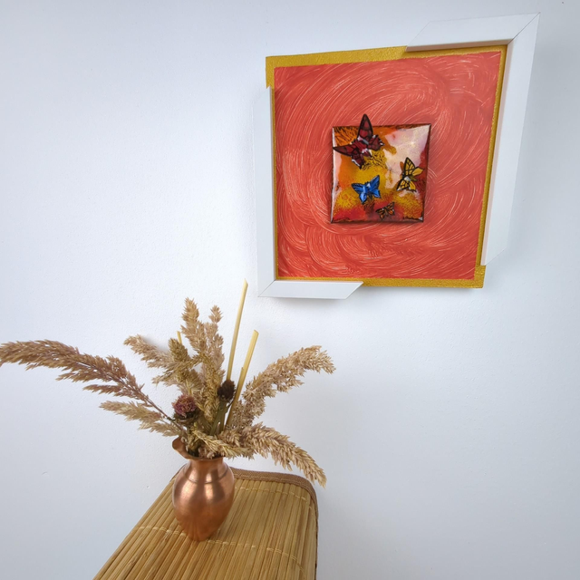 L’encadrement blanc, original et déstructuré, rompt avec les codes classiques et met en valeur la poésie des papillons.