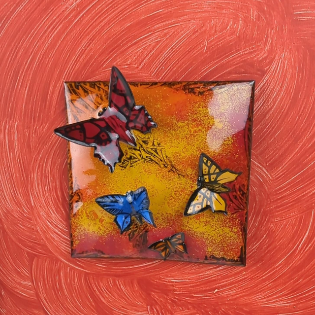 Ce petit tableau en émail sur cuivre captive par sa douceur et son dynamisme. Les papillons en volume, délicatement travaillés, semblent s’envoler.