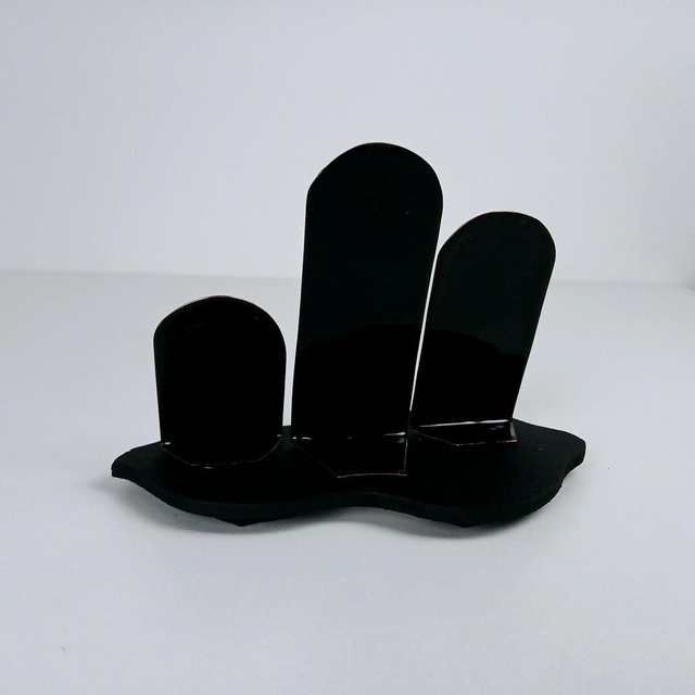 Ce triptyque est monté sur un socle en bois médium peint en noir.