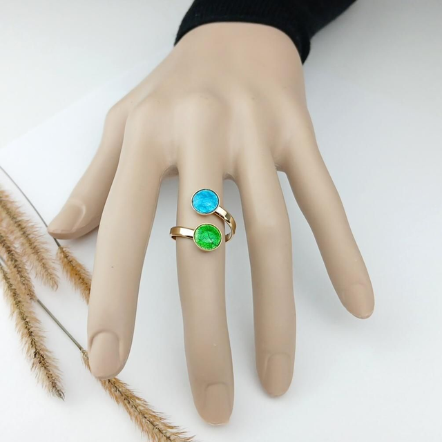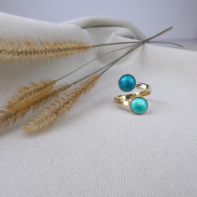 Cette bague est en émail sur cuivre et sur feuille d'argent. Elle est très lumineuse et s'ajustera à plusieurs tailles de doigts.